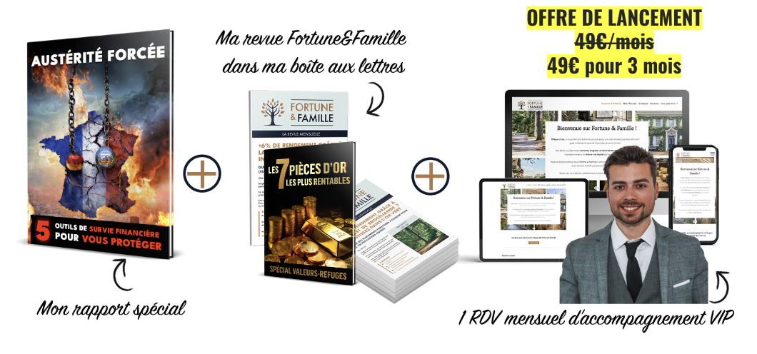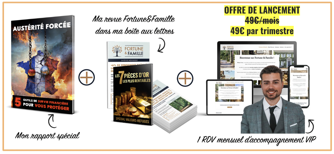 ✅ Ainsi que les 3 prochains numéros de Fortune & Famille afin de faire fructifier votre patrimoine familial sur des placements concrets et à rendement maximal. (valeur : 57€)