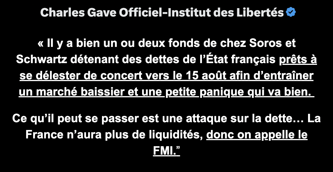 D’après Charles Gave, plusieurs fonds d'investissement se préparent à vendre les dettes françaises à partir du 15 août